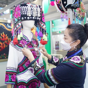 10月27日,商家在创意云南2021文化产业博览会上摆放文创产品。
