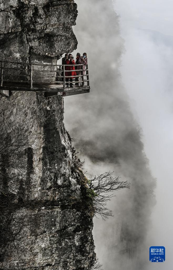 10月28日,游人在龙头山旅游景区空中栈道游玩。
