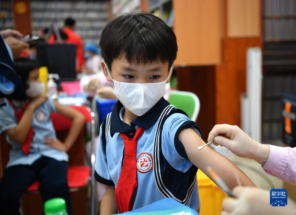 近日,海口市全面启动3到11岁人群新冠疫苗接种工作,医护人员走进校园,为小朋友们接种疫苗。