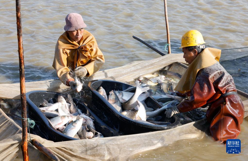 10月28日,唐山市丰南区一生态水产养殖基地养殖户在鱼塘捕捞淡水鱼。