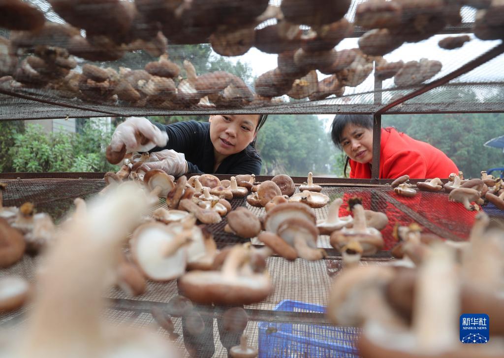 10月28日,三樟镇义门村村民将采摘的香菇摊在烘烤架上。新华社发(曹正平摄)
