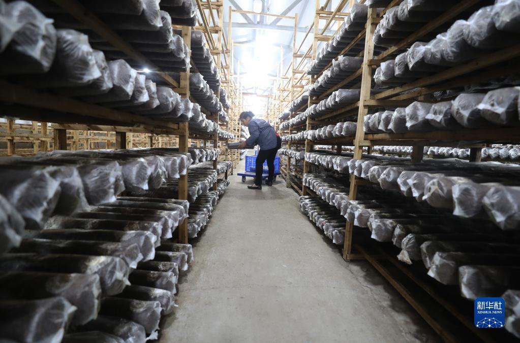 10月28日,三樟镇义门村村民将制作好的香菇菌棒上架。新华社发(曹正平摄)