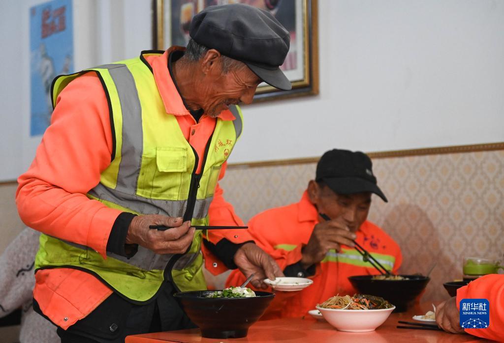 10月28日,在孙记手擀面面馆,环卫工人赵三小(左)给大家分免费的小菜。