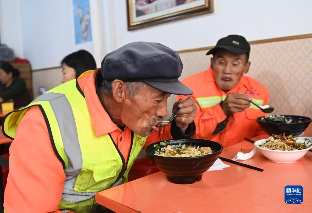 10月28日,环卫工人在孙记手擀面面馆吃面。