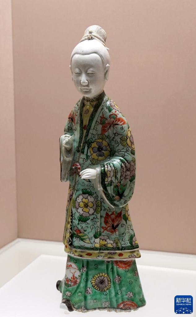 在上海博物馆展出的法国吉美国立亚洲艺术博物馆藏来自中国景德镇的瓷器——五彩中国女子像(10月28日摄)。新华社记者 任珑 摄