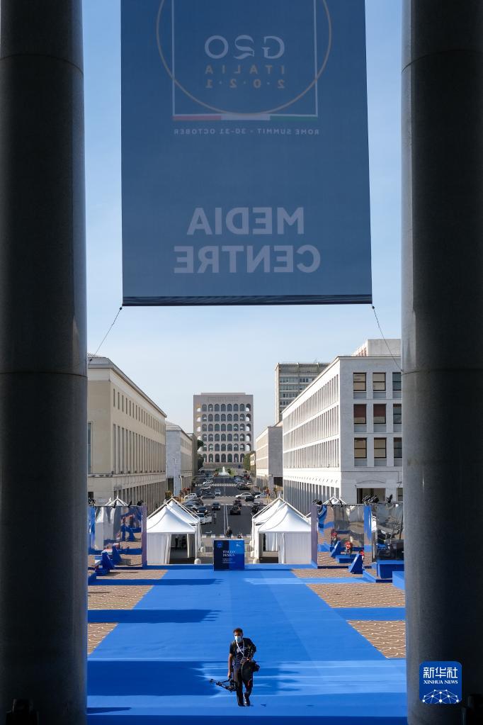 10月28日,在意大利罗马,一名记者走在二十国集团领导人峰会媒体中心。