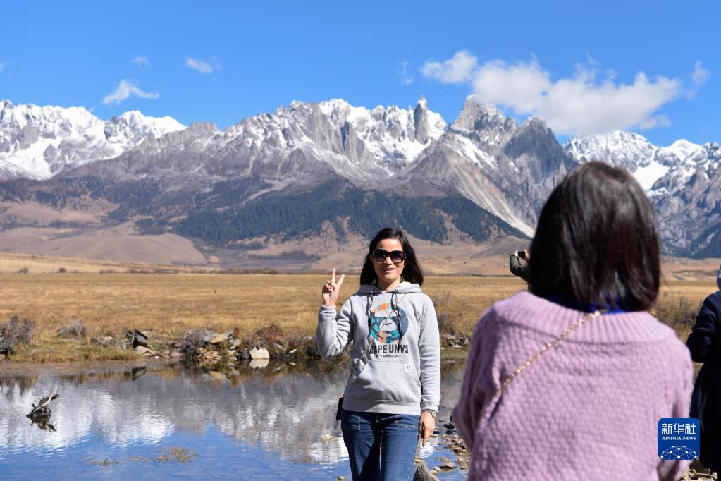 游客在四川甘孜巴塘县措普沟景区内拍照留念(10月24日摄)。