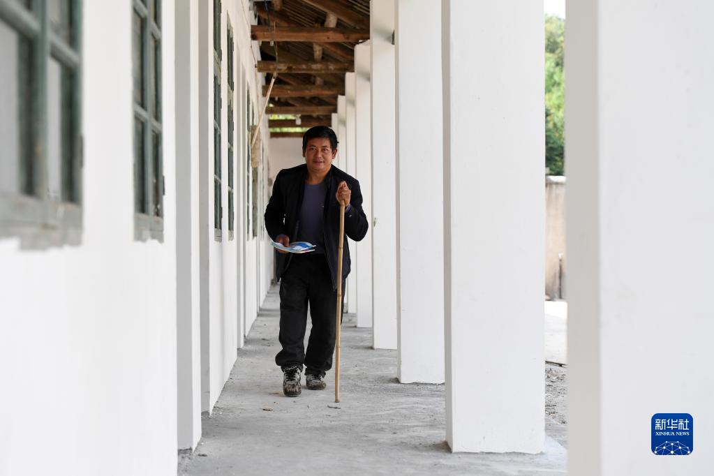 在广西灵川县海洋乡安泰教学点,秦兴国走在学校走廊上(10月28日摄)。