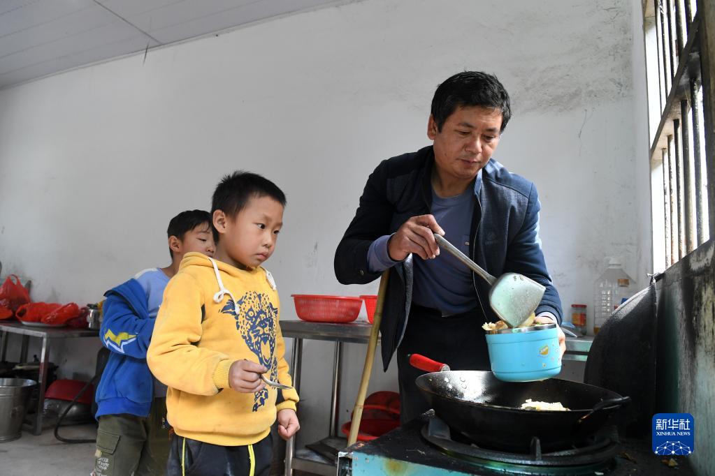 在广西灵川县海洋乡安泰教学点,秦兴国给学生盛菜(10月28日摄)。