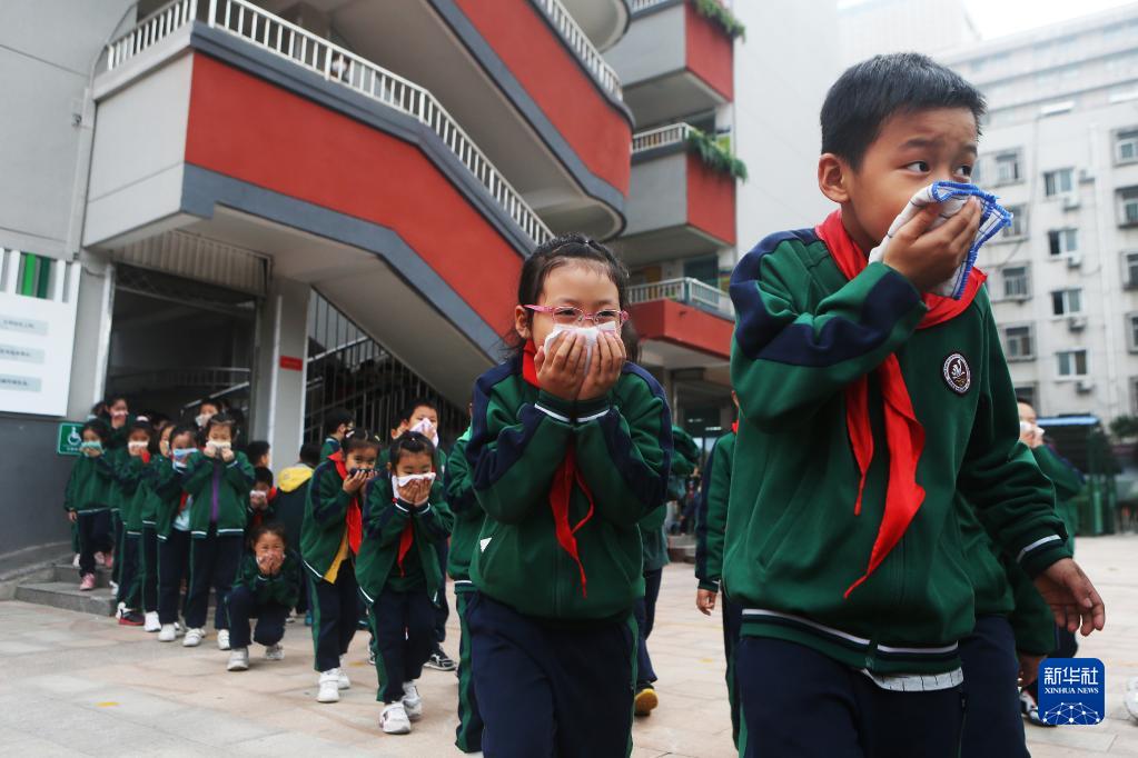 10月29日,在郑州市金水区纬五路第一小学,学生们参加全校消防演练。