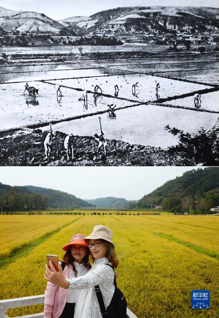 这是一张拼版照片,上图为抗战时期延安南泥湾的生产场景(资料图片);下图为2018年9月12日,游客在延安南泥湾稻田旁留影(新华社记者刘潇摄 )。
