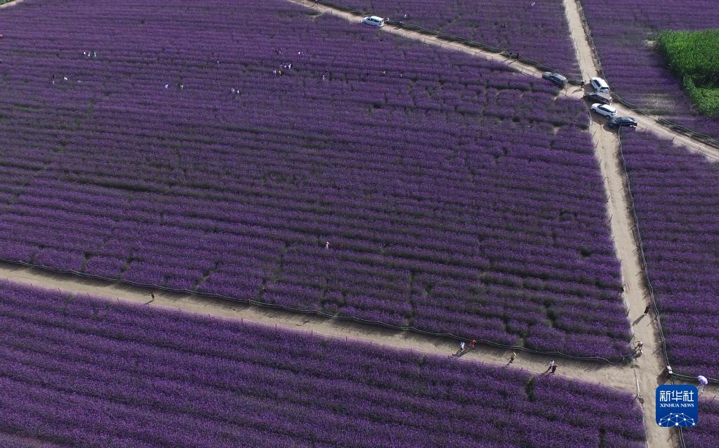 游人在延安南泥湾赏花游览(2020年8月19日摄,无人机照片)。