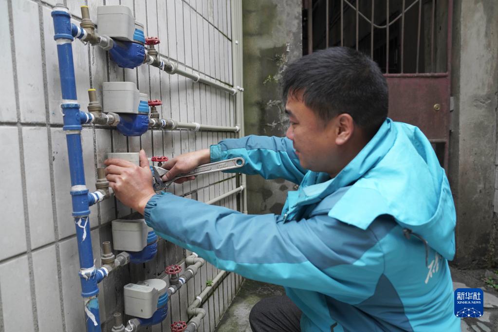 10月29日,在重庆市北碚区天府镇中心村,重庆碚江水务的工作人员在检修水表。