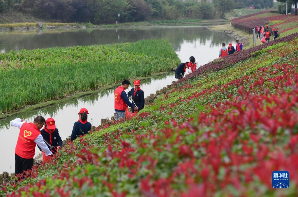10月29日,肥西县上派镇芮祠社区志愿者与中建二局志愿者在潭冲河岸边清理垃圾。