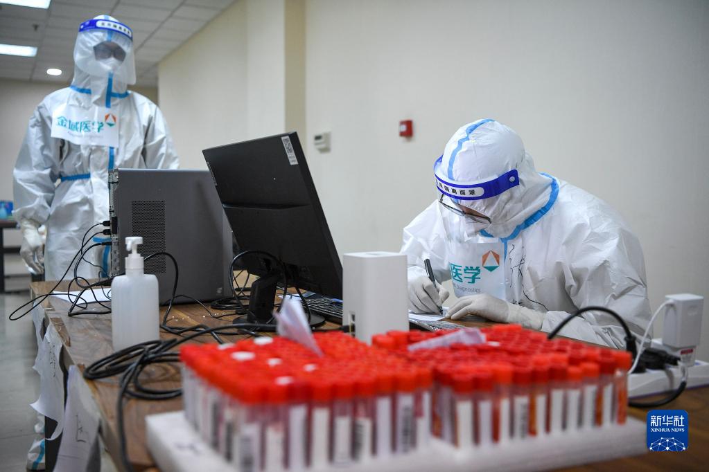 10月29日,“猎鹰号”硬气膜实验室工作人员对接收的核酸样本进行登记确认。新华社记者 冯开华 摄