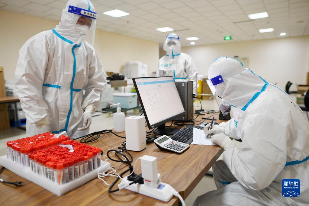 10月29日,样本运送人员(左一)向银川体育馆“猎鹰号”硬气膜实验室外部工作人员交接样本。新华社记者 王鹏 摄