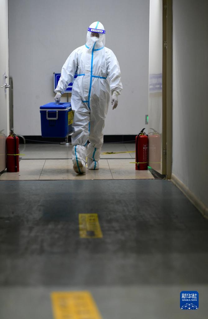 10月29日,样本运送人员将扫描确认过的样本运送至银川体育馆“猎鹰号”硬气膜实验室。新华社记者 王鹏 摄