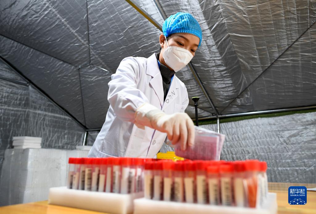 10月29日,银川体育馆“猎鹰号”硬气膜实验室样本接收人员对样本信息进行再次确认并签字。新华社记者 王鹏 摄