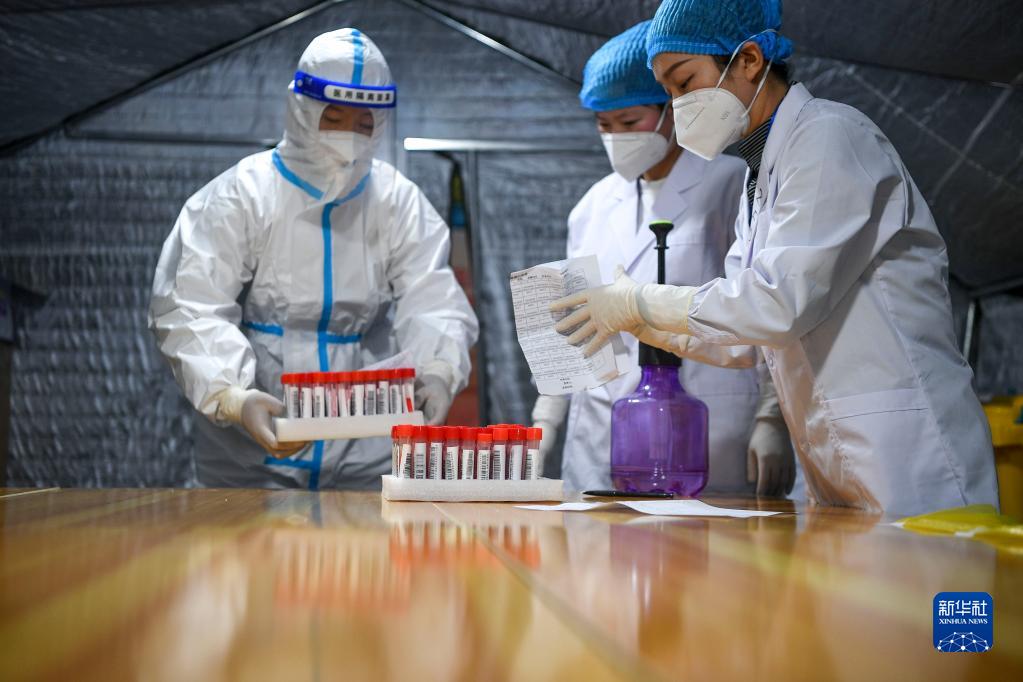 10月29日,“猎鹰号”硬气膜实验室前处理中心工作人员对接收的核酸样本进行再次确认并签字。新华社记者 冯开华 摄