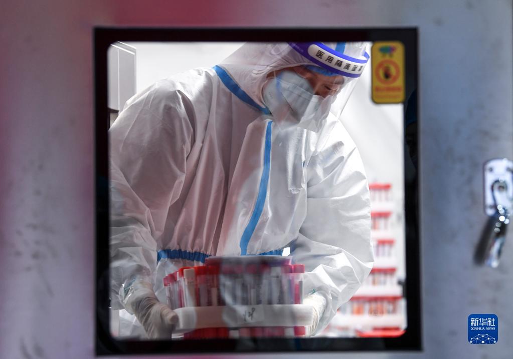 10月29日,“猎鹰号”硬气膜实验室样本处理区工作人员通过传递窗口接收核酸样本试剂盒。新华社记者 冯开华 摄