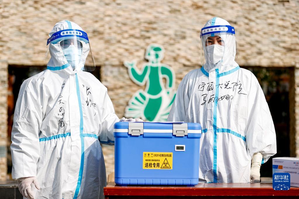 10月28日,在银川市兴庆区一处隔离小区,医务人员将采集的核酸样本放入转运箱等待运送至检验机构。新华社记者 冯开华 摄