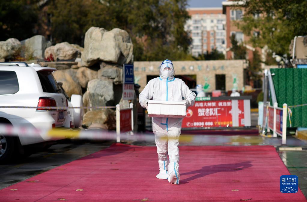 10月28日,在银川市一处隔离小区,样本运送人员将消杀处理过的装箱样本搬出小区准备转运。新华社记者 王鹏 摄