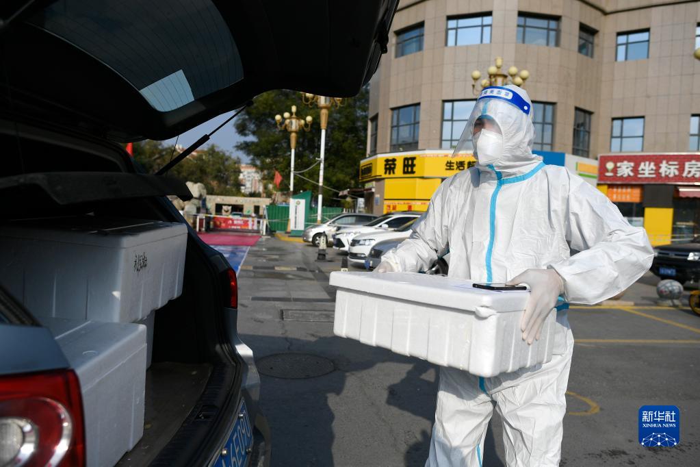 10月28日,在银川市一处隔离小区,样本运送人员将消杀处理过的装箱样本装车。新华社记者 王鹏 摄