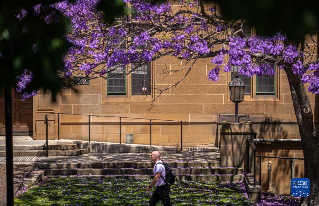 10月29日,一名男子走过澳大利亚悉尼大学里盛开的蓝花楹。