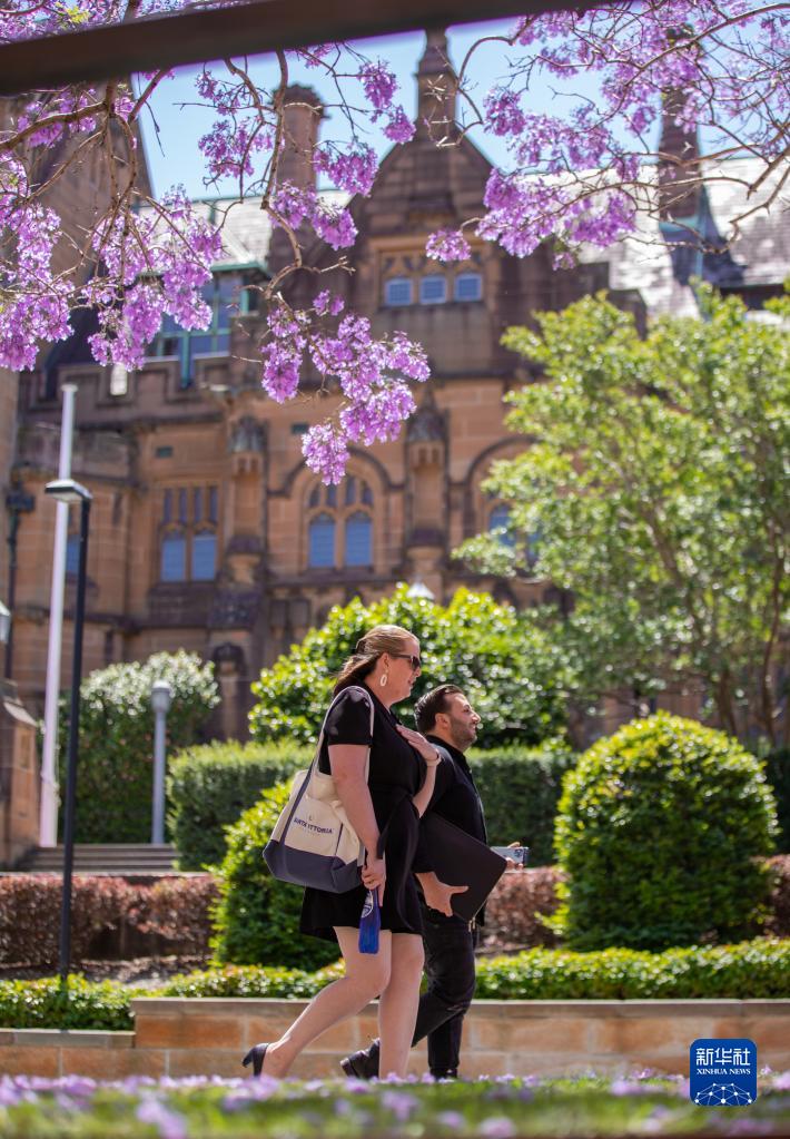 10月29日,人们走过澳大利亚悉尼大学盛开的蓝花楹。