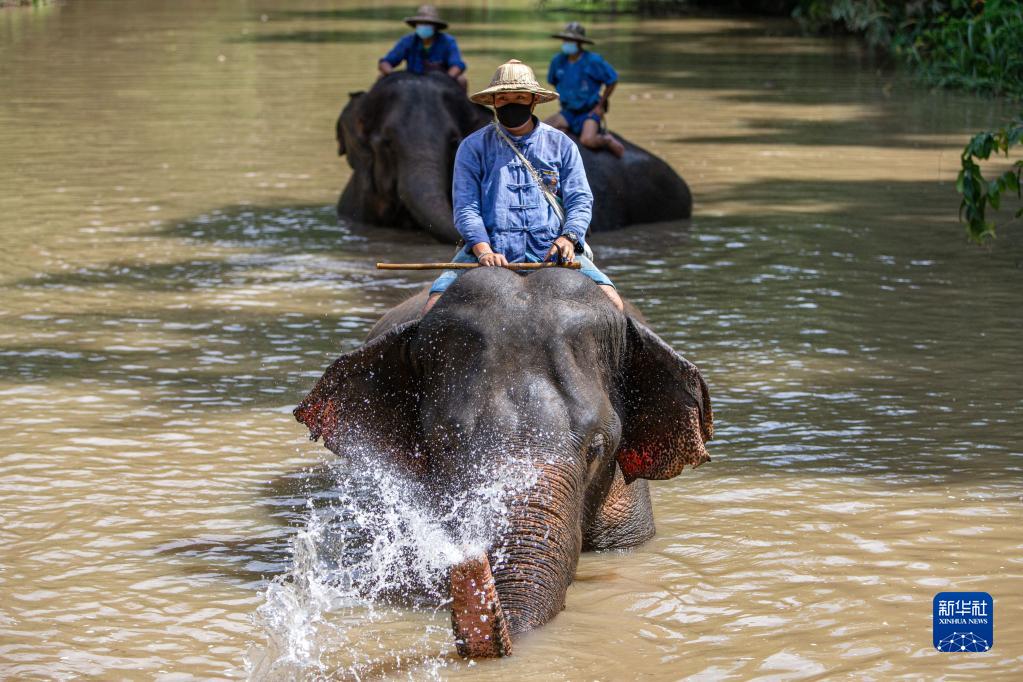 10月27日,大象在泰国南邦府的大象保护中心洗澡。