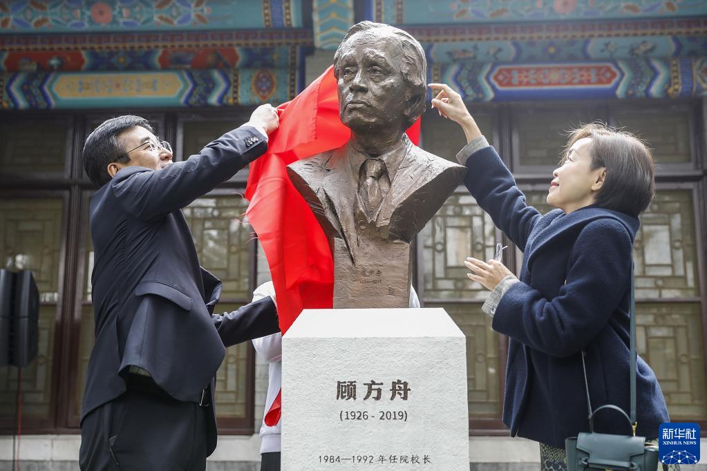 10月29日,中国工程院副院长、中国医学科学院北京协和医学院院校长王辰(前左),顾方舟之女顾晓曼共同为顾方舟院校长雕像揭幕。