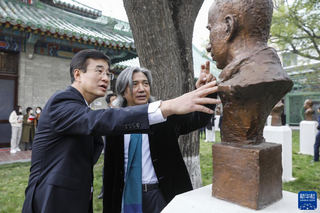 10月29日,雕像的创作者、中国美术馆馆长、雕塑家吴为山(右)为中国工程院副院长、中国医学科学院北京协和医学院院校长王辰介绍雕塑的创作过程。