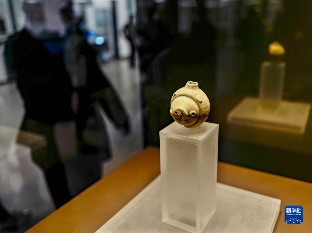 在三星堆博物馆开放式文物修复馆内展出的2020年四川省广汉市南丰镇联合村出土的陶猪,因外形酷似游戏“愤怒的小鸟”的小猪而走红网络(10月29日摄)。