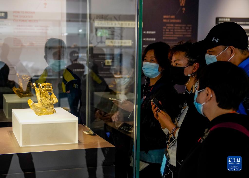 2021年三星堆遗址3号“祭祀坑”出土的金面具,在三星堆博物馆开放式文物修复馆内展出,吸引了众多参观者(10月29日摄)。