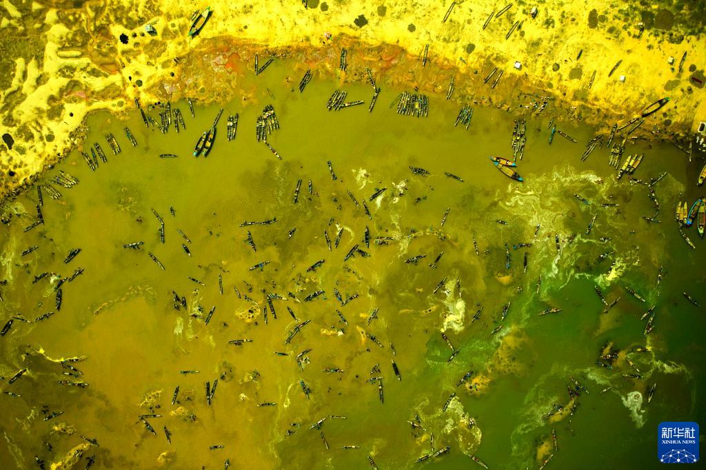这是10月24日在孟加拉国苏纳姆甘杰一条河流上拍摄的采砂的船只(航拍照片)。