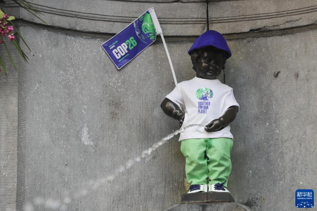 当天,工作人员为布鲁塞尔著名雕塑“小尿童”换上装扮,以呼应即将在英国格拉斯哥召开的《联合国气候变化框架公约》第二十六次缔约方大会。