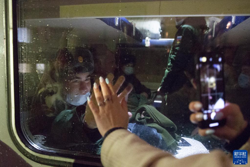 10月27日晚,应征入伍人员在俄罗斯圣彼得堡火车站与亲友告别,乘火车前往服役地。