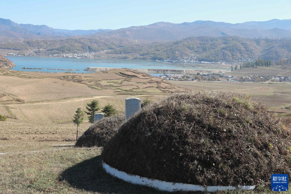 这是10月23日在朝鲜咸镜南道西北部拍摄的长津邑中国人民志愿军烈士合葬墓地。山坡下的湖即为朝鲜北部最大的湖泊长津湖。