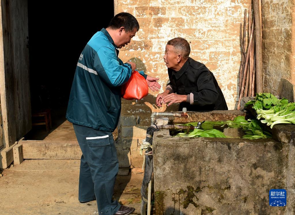 10月28日,在太湖县北中镇桐山村,吴义阳将代购的糯米送到老人手中。