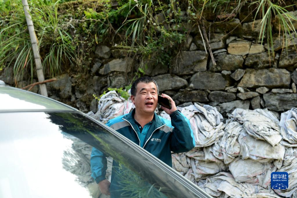 10月28日,在太湖县北中镇桐山村,吴义阳打电话通知村民取件。