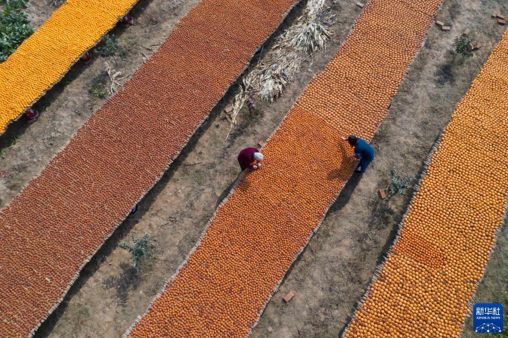 10月30日,万荣县史家埝村农民在加工晾晒柿饼(无人机照片)。