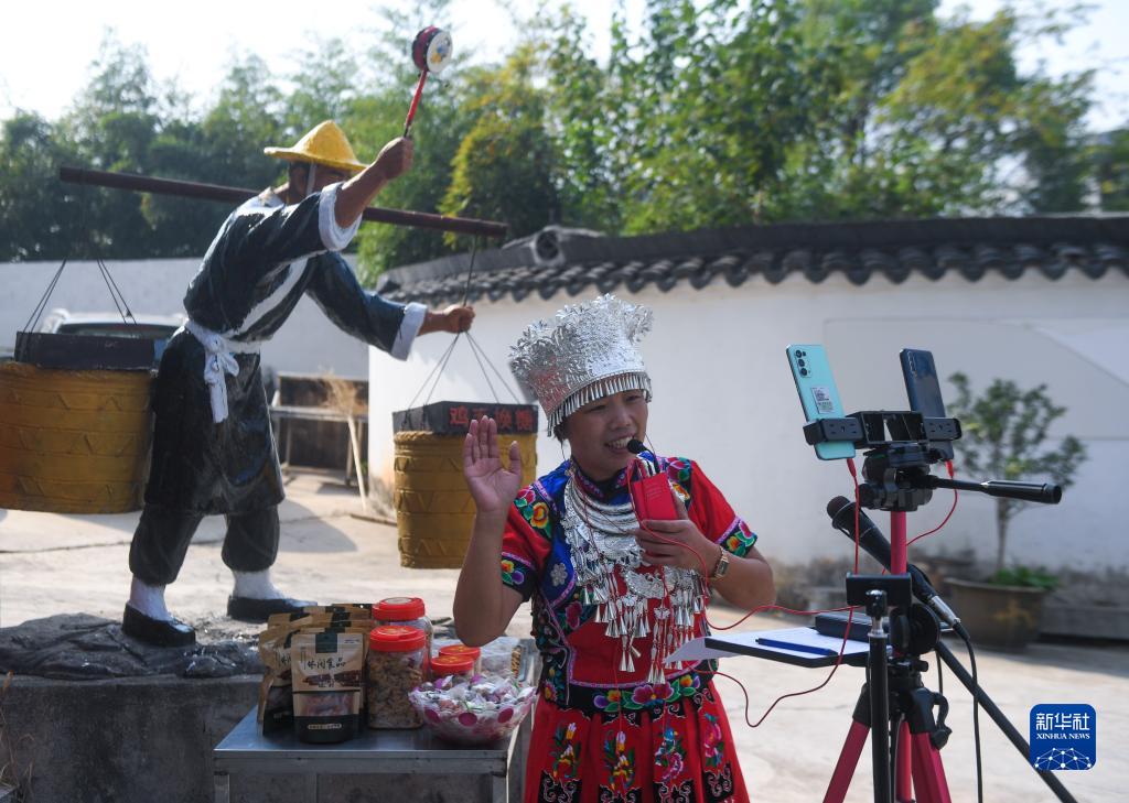 10月31日,工作人员身着民族服饰进行传统红糖直播销售。