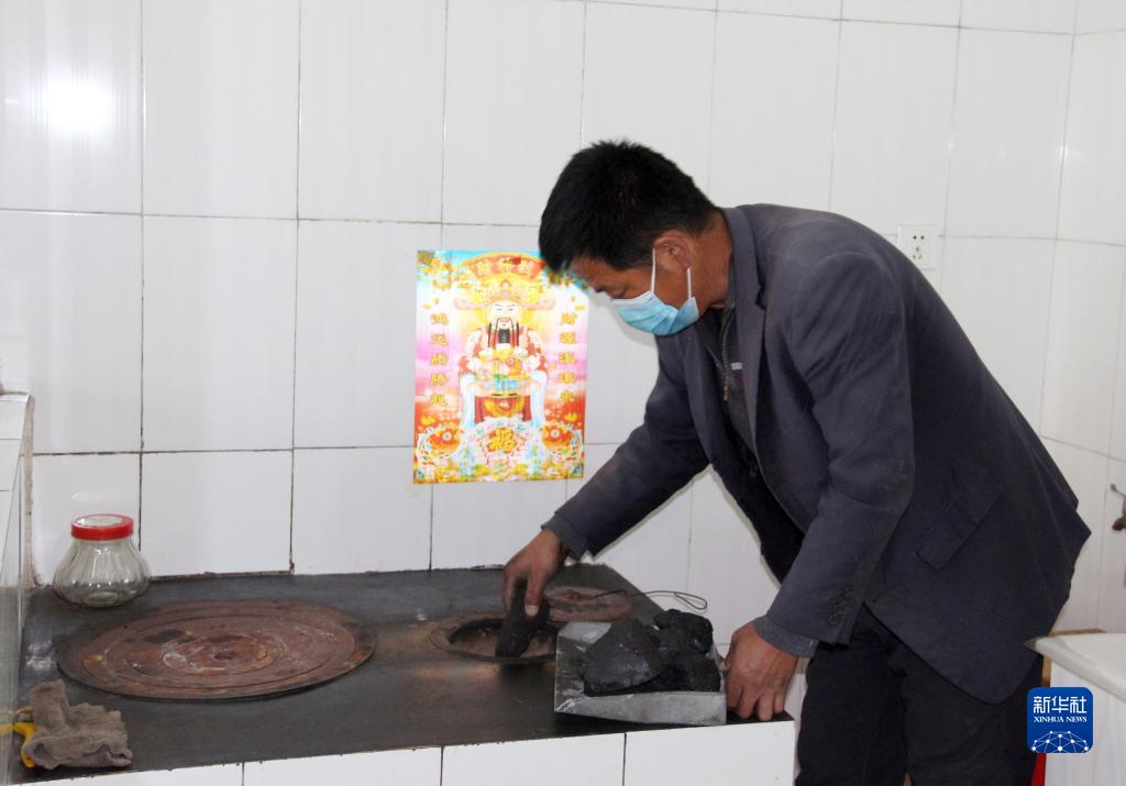 10月28日,内蒙古准格尔旗阿岱沟村村民侯七十六用政府送来的“暖心煤”烧炕炉子。