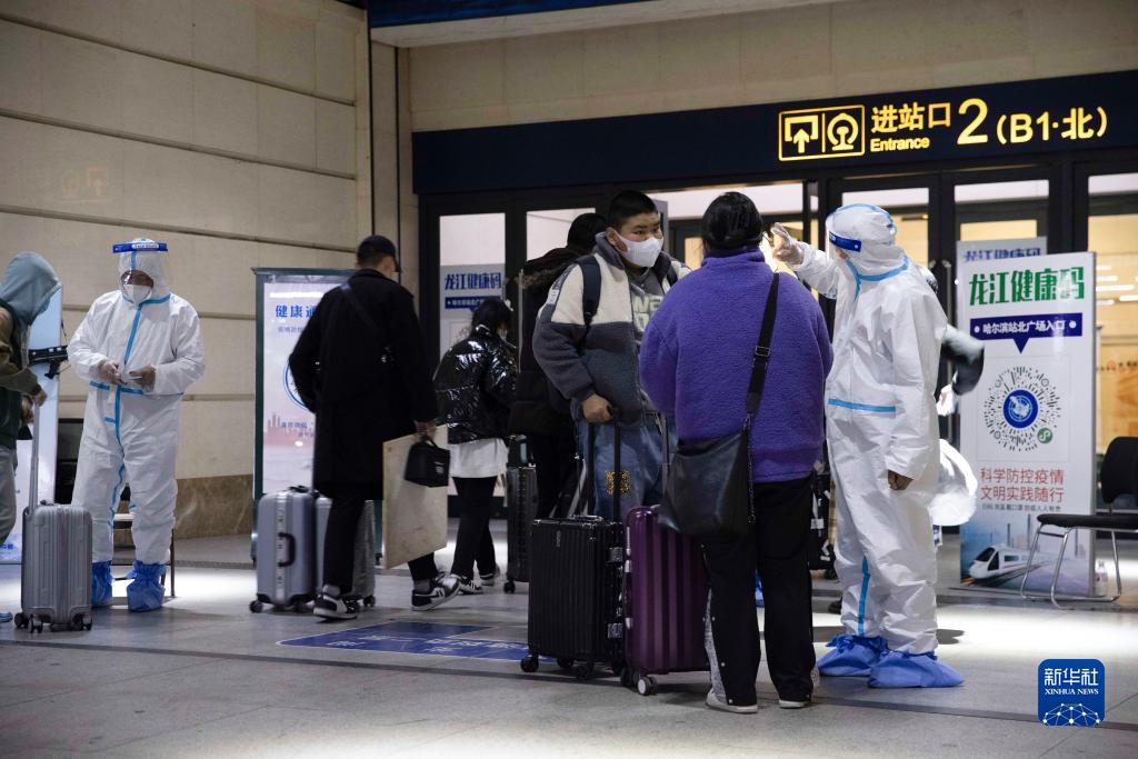 10月31日,在哈尔滨火车站北广场入口处,工作人员查验出行旅客的核酸检测报告。
