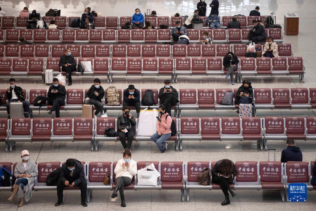 10月31日,在哈尔滨火车站候车大厅,出行旅客间隔落座。