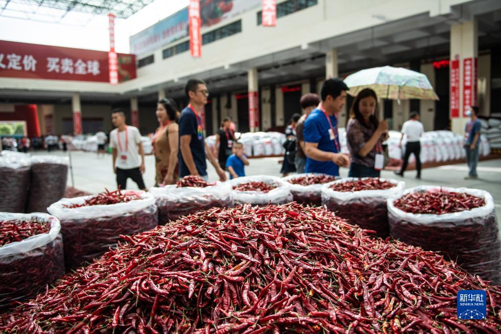经销商从贵州省遵义市新蒲新区中国辣椒城摆放的辣椒前走过(2020年8月18日摄)。