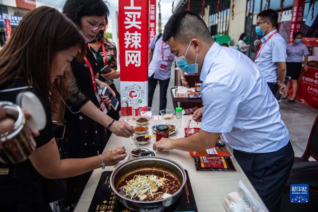 人们在遵义市新蒲新区中国辣椒城品尝辣椒酱(2020年8月18日摄)。