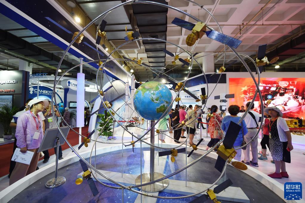 参观者在第二十届中国北京国际科技产业博览会上参观展出的北斗卫星导航系统模型(2017年6月9日摄)。新华社记者 鞠焕宗 摄