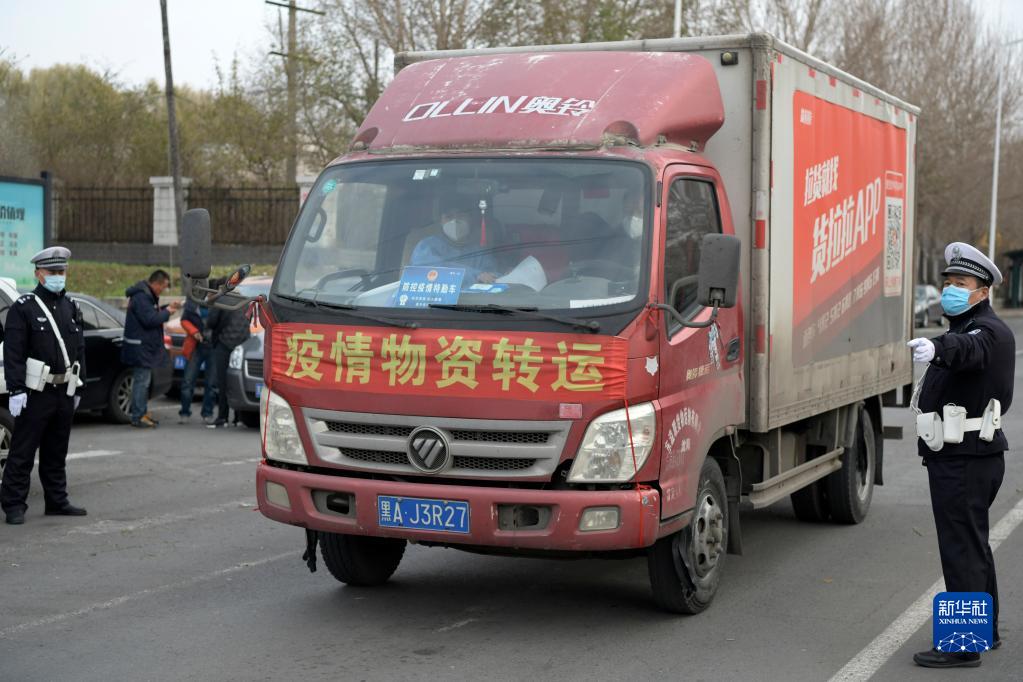 11月1日,在哈尔滨市平房区一出入城区的交通卡口,一辆防疫物资保障车辆准备驶出。