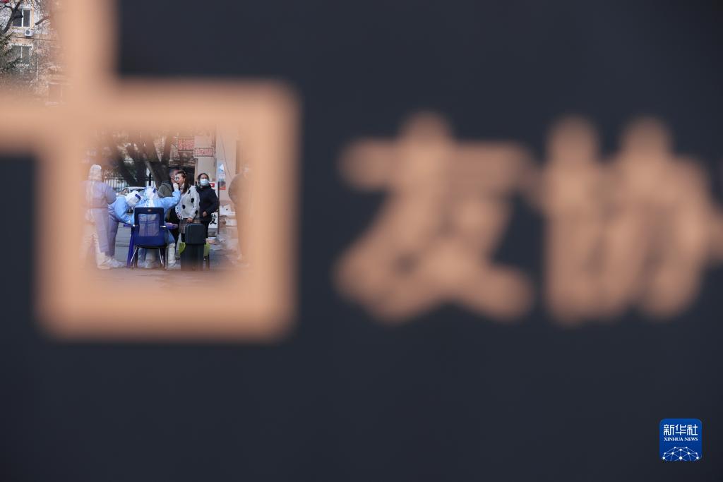 11月1日,在哈尔滨市平房区一处小区内,工作人员在进行核酸采样。